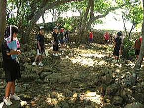 午後から4年生。4つの今帰仁グスクにまつわる伝承をグスクでやる。前回は館内でやったので、まとまりのある発表ができた。それで野外で一度は空中分解させることに。伝承に出てくる場面場面を、現場で確認しながら。空想の場面を描くのではなく、現場を踏まえて物語を考えることに。北谷菜切で切った岩を見てみようか。一瞬、「あっ、ほんとだ!」の表情。