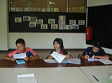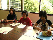 午前・午後と小学生達がグループでやってきます。それぞれ与えられたテーマを持って。どの学年も、一人ひとり異なったテーマや分担で「まとめ」、それを絵にしていきます。そして発表をします。今のところまとめが終わり、時分の分担を絵にしていくところに来ています。絵にすることは、おぼえるだけでなく理解させためです。そこで、いくつもの質問をなげかけてきました。質問に文章で答える仕組み。それを声にして他人に伝えることまで。まとめたことを絵にしていく段階まで来ています。文章にまとめたことを一人ひとり声にして発表していると、友達が手助けをしています。自分の分担だけでなく、友達のも自然と自分のものにしています。