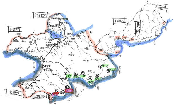 ⑪阿嘉 ⑫比屋定 ⑬宇江城 ⑭山城 ⑮儀間