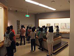 今回の企画展は今帰仁村の一つひとつの集落が描かれた掛軸を展示していくものだった。掛軸を展示する際には、展示作品の高さ、隣りの作品との間隔、作品が平行かどうかを確認しながら行った。展示作品の高さを揃えるのは感覚では難しく、展示する壁に下から1m測った所にロープで印を付け、それに沿って調節を行うと簡単に展示することができた。微調整は二人掛かりで行った。大体の所で昼食休暇をとり、もう一度展示作業を行った。 午後からは「ちゅら海水族館」へ行くことになっていたので、館を出る前に最後のミーティングを行った。水族館も博物館のひとつだが、生き物を扱うこともあり展示方法には色んな工夫がされていた。特にちゅら海水族館はジンベエザメやマンタの長期飼育記録、ジンベエザメの繁殖を目指した複数飼育、サンゴの大規模飼育展示など世界初!と言われるものが沢山つまっている水族館だった。また、アクアラボと言われる実験室も設置されていて知識を深めることができた。