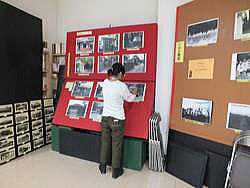 明日は実質、移動日になるので最後の実習日だった。今日も朝は館内の掃除から始まった。階段と講堂の二手に分かれ、ほうきがけを行った。掃除が終わった後は講堂に戻り、実習内容をまとめる時間があった。その後に仲原館長と4人で昨日の振り返り、今日1日の動きなどの確認をするミーティングを行った。午前中はまず、22日に展示を取り外した部屋に次の企画展を行う為、その準備に取りかかった。まず今まで通りの部屋に展示品をいくつか置いてみた。その後に新しく部屋の構図を考え、展示台の位置を変えたり、パネルの位置を動かした。大体の展示場所が出来あがると仮展示をスタートさせた。
