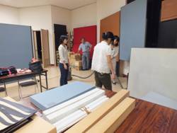 ・手作りの作業台やパネルを動かしながら汚れが出てきたものを掃除機をかけた。室内のバランス、展示する台の調節をした。展示する高さは作品の一番下の部分が1mである。黒いビニールひもを床から1mの高さになる様に床の面と平行にし、画鋲でとめ目印にした。
