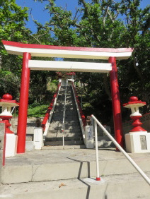 ▲お宮(ウタキ)への神道 ▲昭和9年に建立された「謝名神社」(お宮)