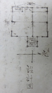 設計 横三間半、縦三間、中に神棚を設け押入れを設け玄関を構る。
