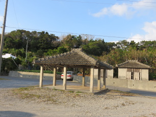 見える杜は御嶽(ウタキ)である。杜の中にお宮(ウタキのイベ)、神アサギ、脇地頭火神、旧家跡が何軒かある。また杜の右手、道路を越えた所にも旧家跡やカーなどがあり、集落跡が今でも残っている。