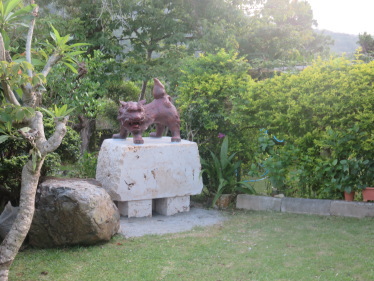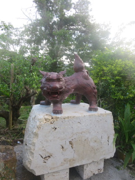 シーサーを設置する。旧暦4月15日 玉城ノロ管轄ムラ(玉城・謝名・平敷・仲宗根)の方々がスムチナ御嶽に集う。謝名の区長はじめ10名余りの方々が立ち寄って行かれた。シーサーの批評会。普段の日は、誰もいませんのでご自由に。シーサーをなでると噛みつかれますよ。(石ではないので。漆喰づくり)