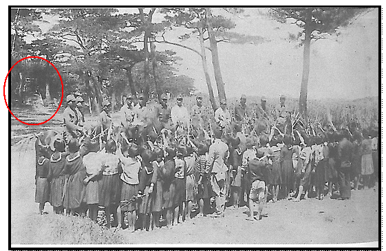 今帰仁村の忠魂碑の写真を見つける。昭和10年代の「出征兵士の壮行会」が今帰仁村の仲原馬場で開催されている。仲原馬場の西端に鳥居と階段のある忠魂碑が確認できる(