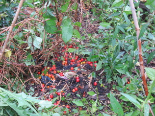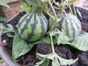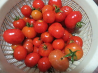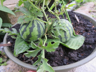 時々、雨があったので「寡黙庵」の庭の草が一気にののびている。除草してみるとミニトマトが実っている。大分落下しているが、摘んで家に持ち帰り。スイカも二個実っている。まだ、ソフトボールほどの大きさ。収穫まで育つか?
