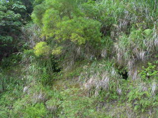 ▲ウタキの斜面の防空壕の口 ▲防空壕の内部、隣の壕との連絡口