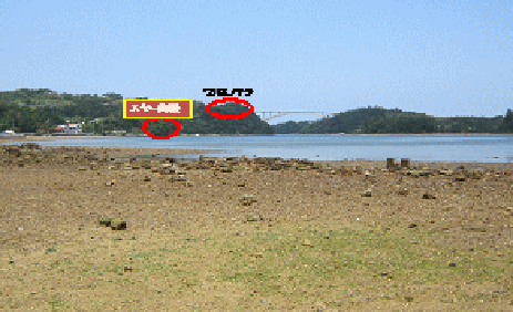 ▲手々原の塩田跡からみた屋我名島 ▲手々原の塩田跡の石垣