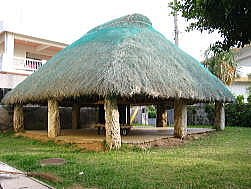 ▲茅葺屋根の恩納の神アサギ ▲神アサギの屋根裏の様子