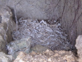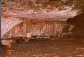 ▲墓室の内部(石棺が10基余) ▲墓室内の頭骨 ▲対岸のキーバカ